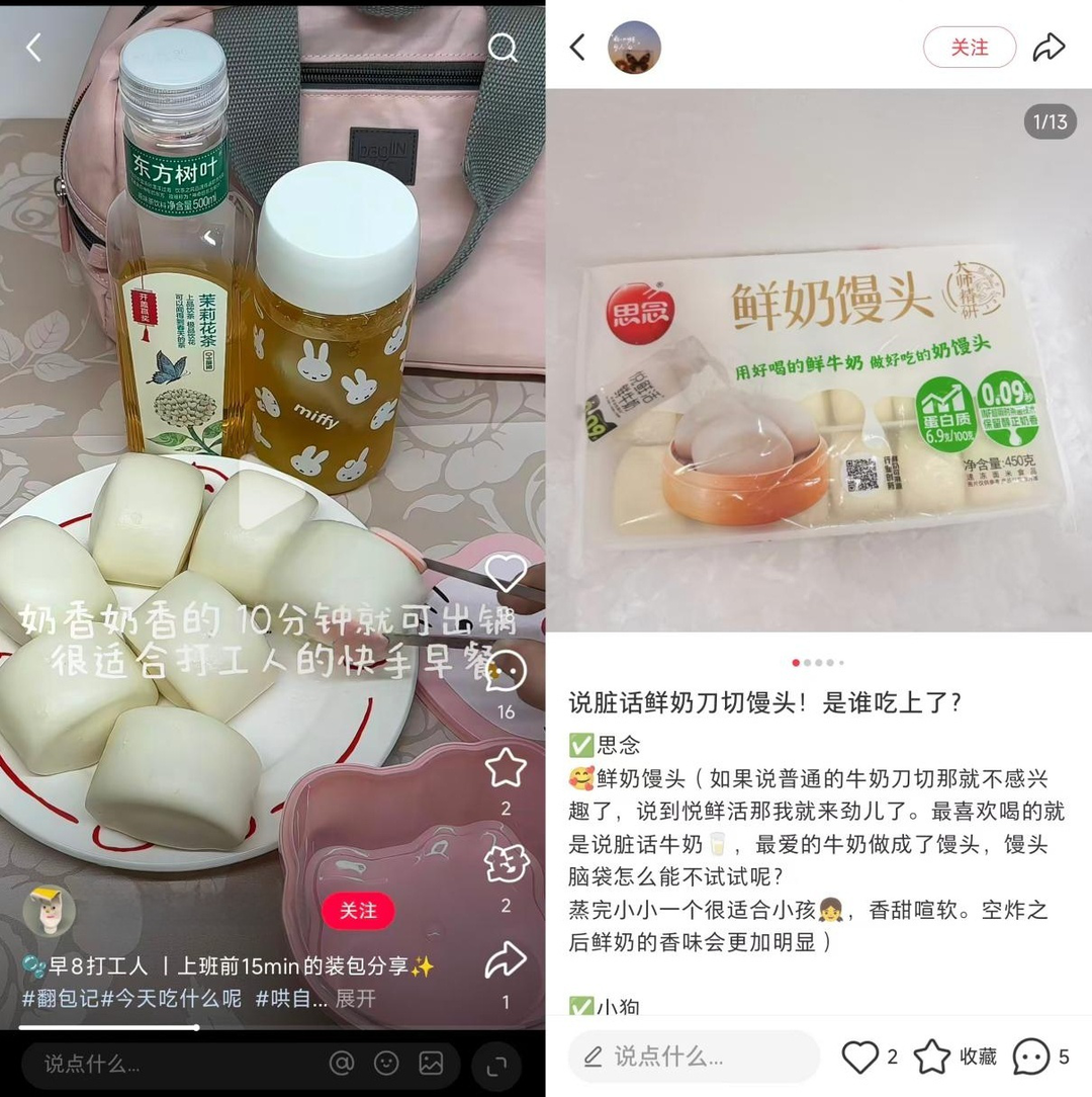在传统认知里,馒头是餐桌上的饱腹主食,但在今天的社交平台上,它正被年轻人赋予新的身份。社交平台上不乏年轻消费群体的创意制作和探讨,比如加芝士、水果、果酱等,摇身一变成为精致的下午茶甜点;同样,围绕思念大师精研面点奶呼呼的外形和醇香口感,也衍生出“水光肌馒头”、“说脏话馒头”、“馒门永存”、“早餐搭子”等趣味话题讨论。馒头已超越传统主食的范畴,进化为情感联结与社交分享的载体。